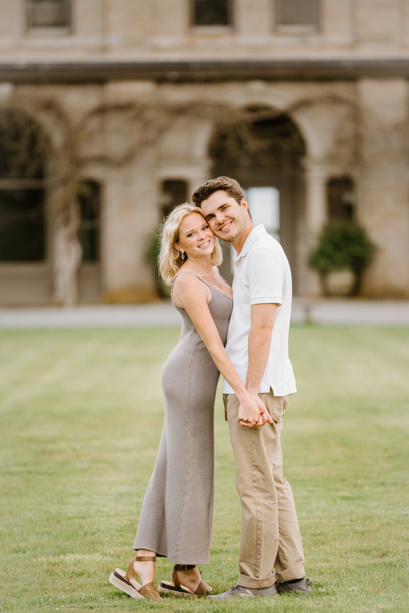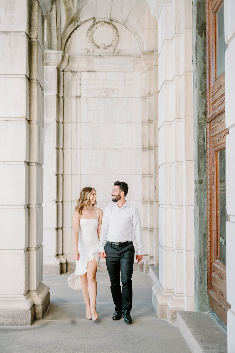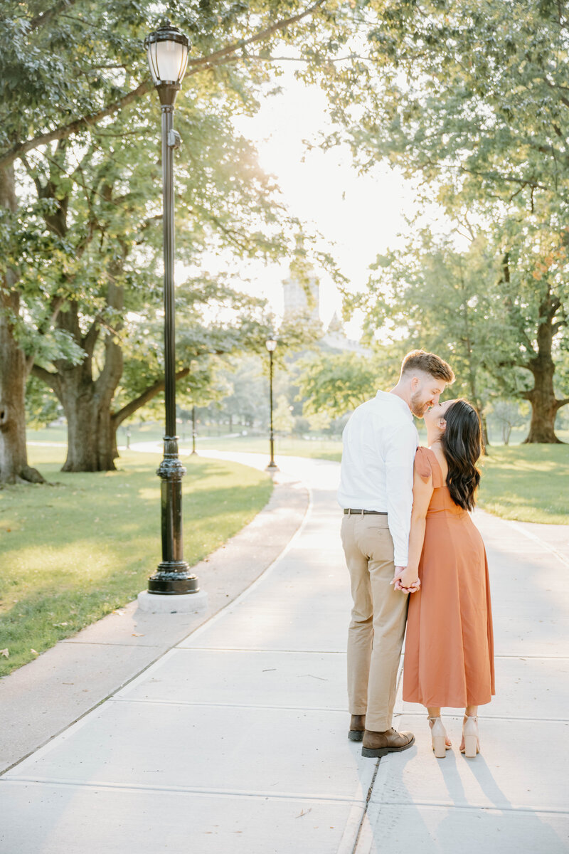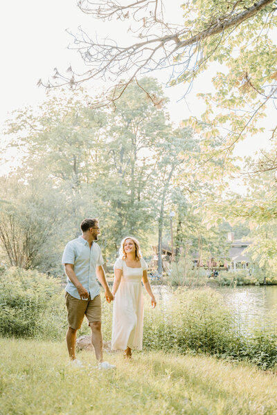 Generally couples pick two outfits for an engagement session: a more formal outfit and a casual outfit. I recommend saving your favorite outfit for later in the session, when couples usually feel more comfortable in front of the camera. And don’t forget to bring a few accessories! Statement necklaces, cute shoes and classic watches are great ways to add detail to outfits.